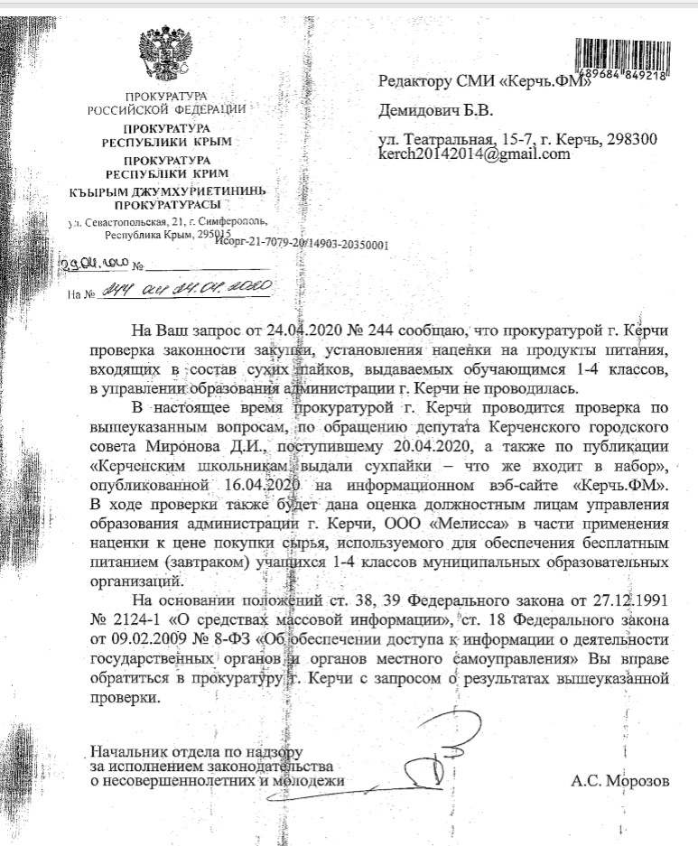Прокуратура Керчи начала проверку по поводу наценки на продукты для школьников в сухпайках. Ответ на информзапрос Керчь.ФМ предоставила Прокуратура Крыма.