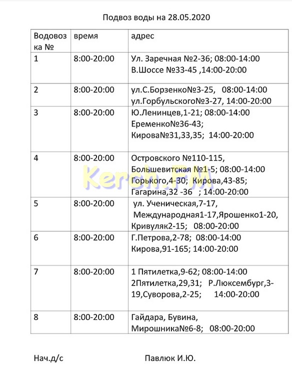 В связи с продолжением аварийно-восстановительных работ на водоводе Д=700 мм по ул. Сергей Борзенко угол ул. Самойленко Керченский филиал ГУП РК «Вода Крыма» предоставляет откорректированный график подвоза воды 28 мая в бывший Ленинский и Кировский районы г. Керчи, - передает Керчь.ФМ.