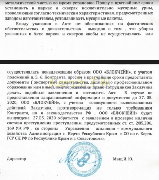 До настоящего времени договор ООО «Блокчейн» с ГУП РК «Крымэкоресурсы» не заключен только по причине несогласования со стороны Заказчика права использования Подрядчиком в ходе исполнения Контракта муниципальных площадок для ТКО. В Контракте не указано, где обязан складировать образуемые отходы Подрядчик, своих площадок и баков ГУП РК «Крымэкоресурсы» не имеет», - уточнил руководитель Блокчейна.