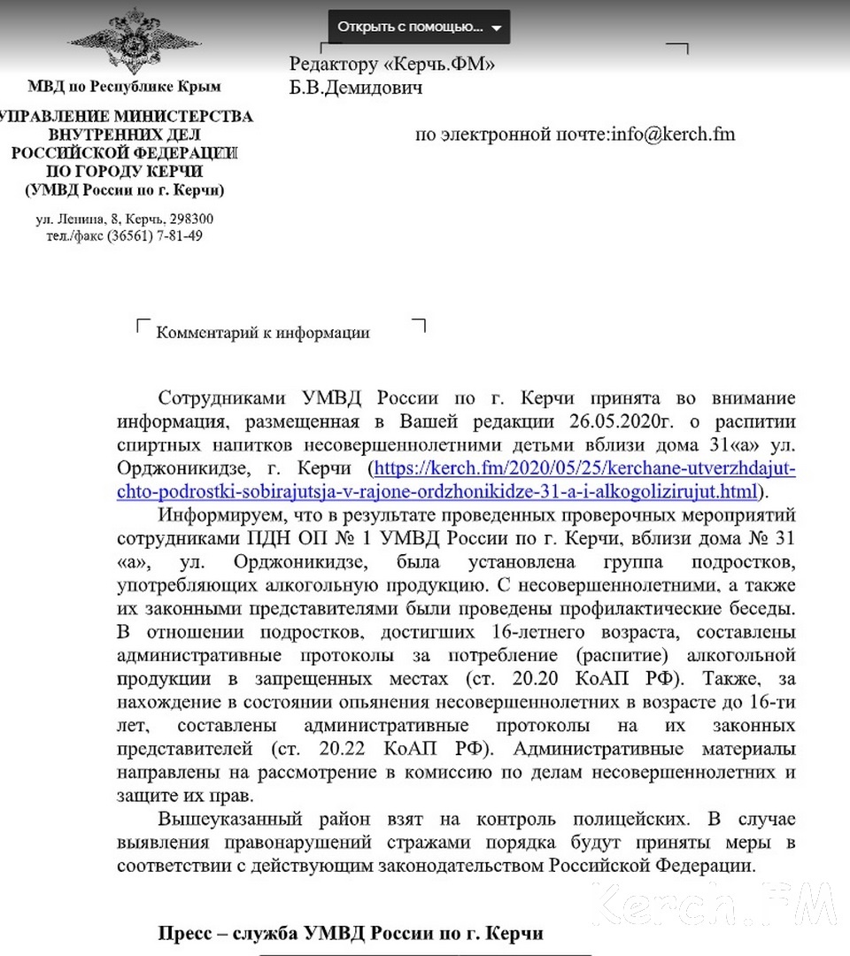 Полицейские Керчи после публикации на сайте нашли алкоголизирующих на ул. Орджоникидзе подростков. В отношении тех, кому исполнилось 16 лет составлены протоколы об админправонарушениях, а у их младших собутыльников привлечены к ответственности родители. Соответствующий комментарий прислала в редакцию Керчь.ФМ пресс-служба УМВД России по г. Керчи.