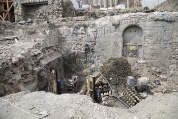 Начали с Константиновской лестницы. Работы здесь уже приближаются к завершению. Осталось отшлифовать стены и ступени.