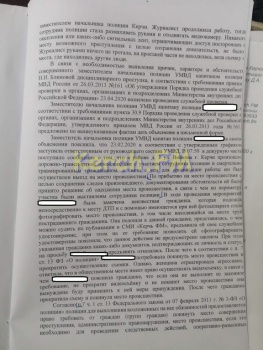 Даже если предположить, что журналист слишком близко подошла к месту аварии, чем могла помешать следственным действиям, то место происшествия, в соответствии с Инструкцией, должно быть обозначено доступными для сотрудника полиции способами. Никаких ограждений, сигнальных лент и тому подобного на месте происшествия не было. Если судить по словам сотрудника полиции, в отношении которой проводилась служебная проверка, то там были выставлены по периметру сотрудники полиции. Но на фото и видео, сделанными журналистом во время подготовки материалов, видно, что все сотрудники полиции собрались у машины полицейского, участвовавшего в ДТП. Даже зайти за них, чтобы сделать фото для статьи было невозможно, так как они стояли вплотную к этой машине.