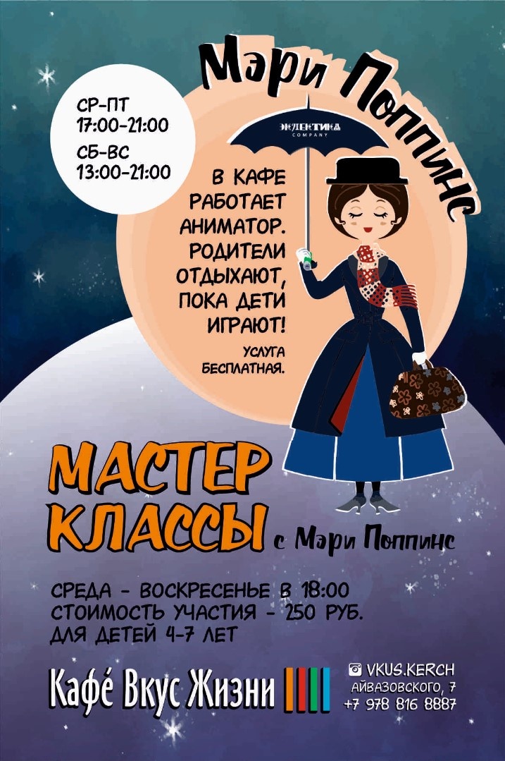 Мэри Поппинс вернулась! В кафе «Вкус Жизни» снова работает аниматор. Пока дети играют под присмотром, родители отдыхают. Услуги аниматора бесплатные! График работы: