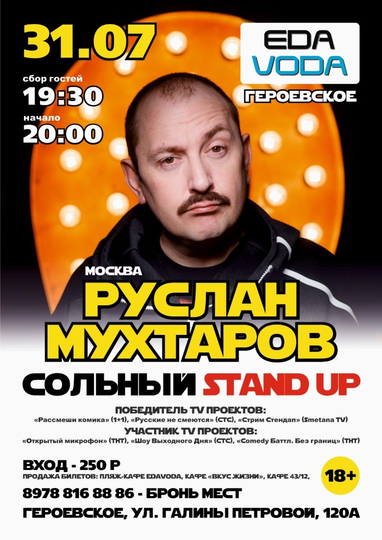 31-го июля, в пятницу, EDAVODA приглашает гостей на сольный STAND UP концерт Руслана Мухтарова (г. Москва). Легендарный комик является победителем таких ТВ проектов, как: «Рассмеши комика» (1+1), «Русские не смеются» (СТС), «Стрим Стендап» (Smetana TV); участником таких ТВ проектов, как: «Открытый микрофон» (ТНТ), «Шоу Выходного Дня» (СТС), «Comedy Баттл. Без границ» (ТНТ); полуфиналистом Высшей лиги КВН в составе команды «Будем дружить семьями».