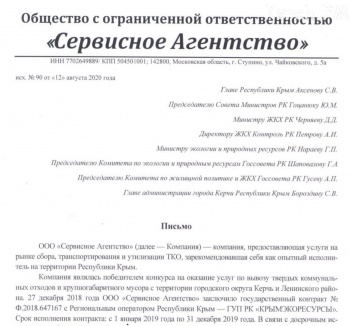 «С начала работы с 1 января 2020 года в качестве субподрядчика до настоящего времени ни одной оплаты за услуги, предоставленные ООО «Сервисное агентство» от ООО "УПРАВЛЕНИЕ МЕЖРАЙОННОГО ЭКОЛОГИЧЕСКОГО СЕРВИСА" не было. Отсутствие оплат ООО «УМЭС» объясняет задолженностью перед ними ГУП РК «Крымэкоресурсы» в размере около 200 млн рублей с марта 2020 года