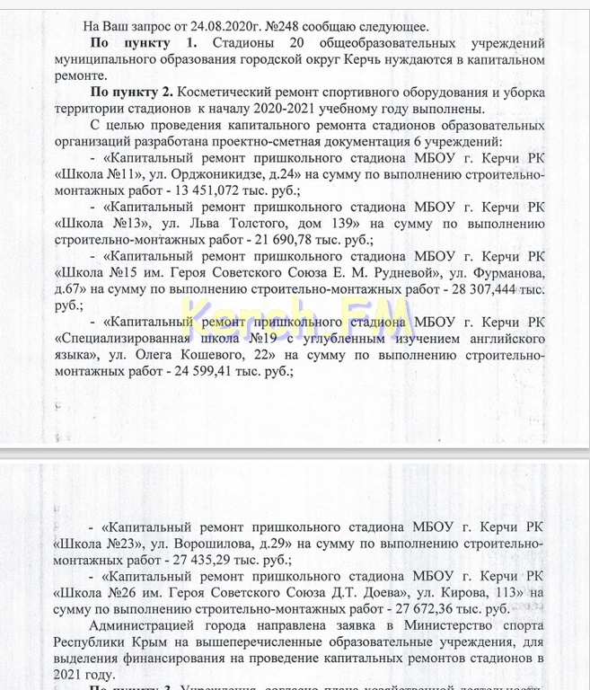 Примерно такой же ответ был в июне прошлого, 2019 года, который давал редакции местный депутат Дмитрий Андропуло по школьным стадионам. Тогда, по его словам, экспертиза вынесла положительное решение по проектам капремонта шести пришкольных стадионов в Керчи.