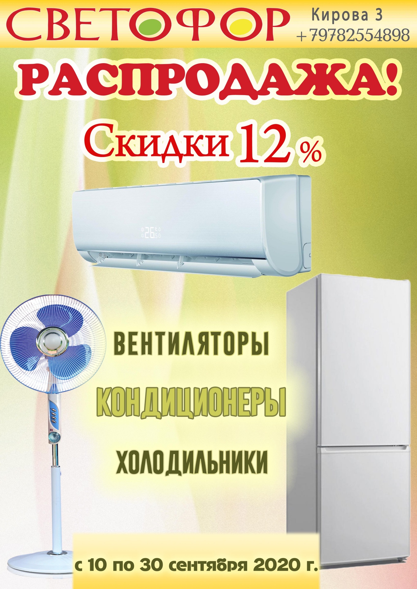 Осенняя распродажа, скидки 12% на: кондиционеры, холодильники, вентиляторы. С 10 по 30 сентября 2020 года. магазин «СВЕТОФОР» Керчь ул. Кирова дом 3. тел. +7(978)255-48-98