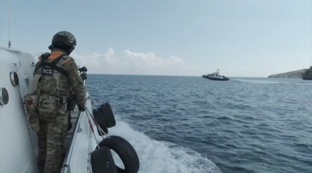 По легенде учения, члены террористической группы под видом пассажиров проникли на гражданское судно и захватили заложников. Силовики ликвидировали угрозу.