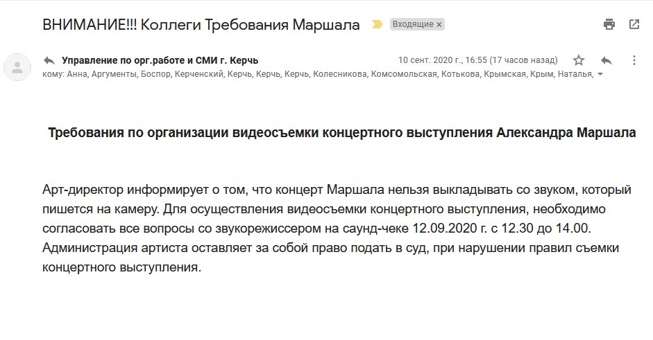От администрации Керчи пришло письмо, в котором говорилось о требованиях по организации видеосъемки концертного выступления Александра Маршала.