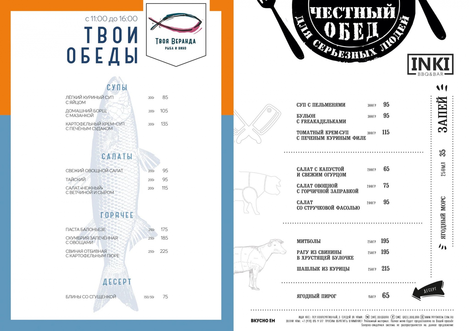 Каждую неделю с понедельника по пятницу Твоя Веранда. Рыба и вино, INKI.BBQ&BAR с 11:00 до 16:00 готовят вкусные обеды по честным ценам!