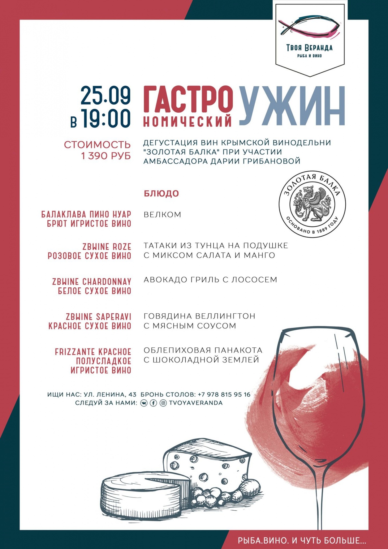 Гастрономический ужин и дегустация напитков крымской винодельни «Золотая Балка» на Твоей Веранде. Рыба и Вино - интересно, познавательно и очень вкусно!