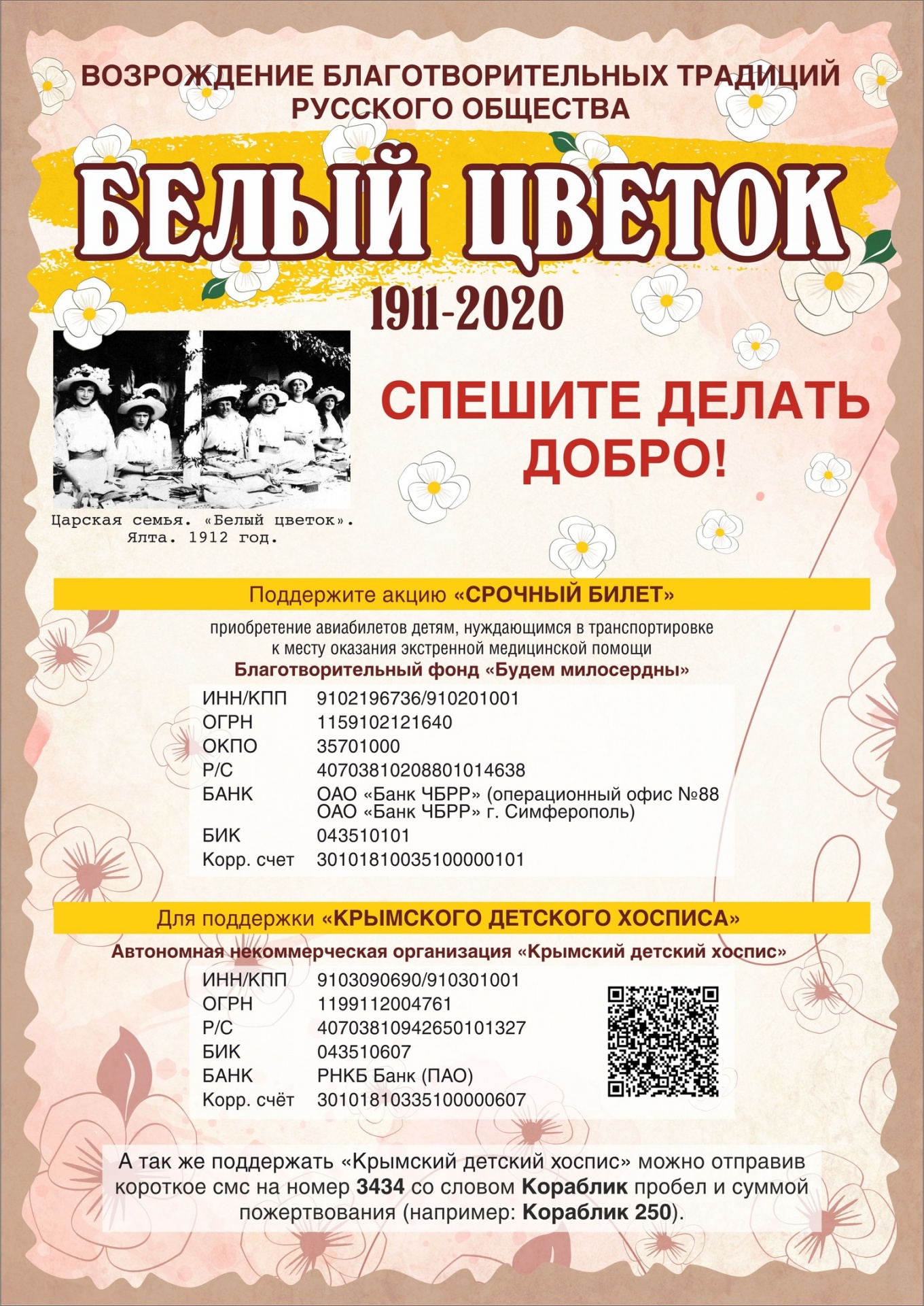 В рамках акции будет организован сбор средств для приобретения авиабилетов детям, нуждающимся в транспортировке к месту оказания экстренной медицинской помощи, а также средств на создание «Крымского детского хосписа».