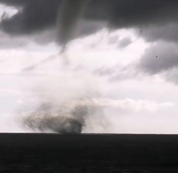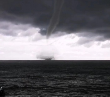 В коротком ролике видно, как над морем «пляшет» огромная воронка. Все этой действо сопровождает шум ветра и волны.
