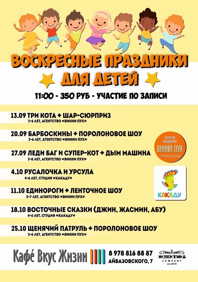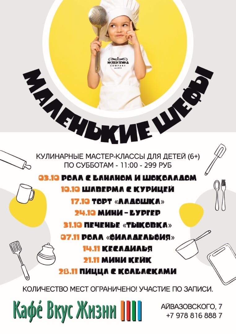 По субботам учимся готовить, по воскресеньям как следует веселимся! Занимательные выходные с кафе «Вкус Жизни». Количество мест на мероприятия ограничено. Предварительная запись открыта на все события (дети без записи принимают участие в порядке живой очереди при наличии свободных мест). Записать ребенка можно по телефону (8978 816 8887 / 8978 835 9444).