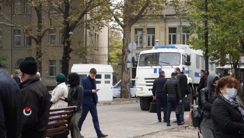 В это же время к зданию подъехал автозак с силовиками, пустой автобус. У здания работают сотрудники полиции, ЦПЭ, ФСБ - в гражданской одежде. Всех пришедших снимают на оперативную съемку.