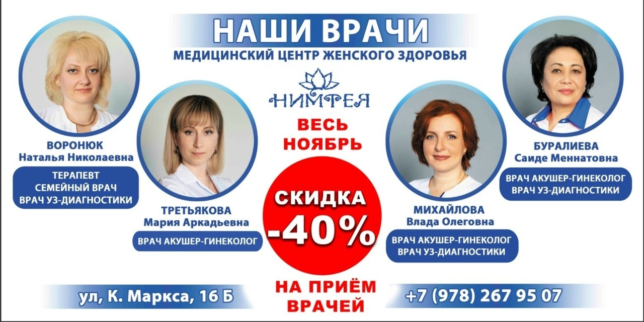 С заботой о женском здоровье мы делаем скидку - 40% на первичный прием врачей.