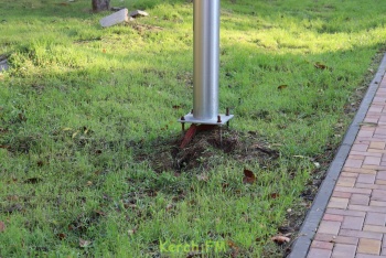 Также необходимо обратить внимание на устройство столбов освещения - основания приподняты над землей, закреплены болтами, которые торчат, кабели, подводящие электричество выведены наружу, что является нарушением технологических требований и правил безопасности.