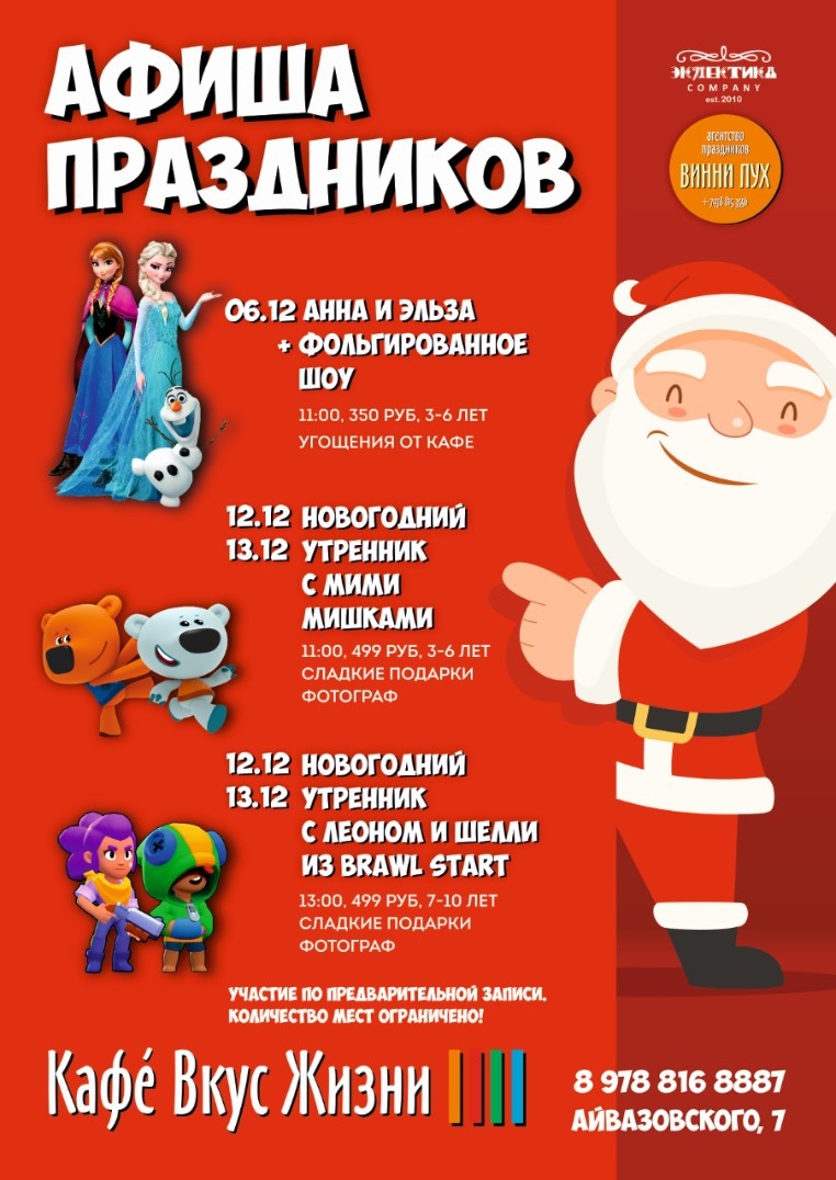 Афиша детских праздников в декабре совместно с агентством праздников «Винни Пух». Запись открыта на все мероприятия. Записаться можно по телефону: 8978 816 8887 или 8978 835 9444.