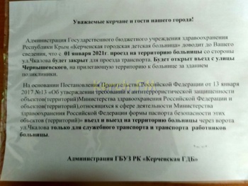 С 1 января въезд в детскую больницу на Чкалова в Керчи будет осуществляться только со стороны улицы Чернышевского. Старый въезд со стороны Чкалова будут использовать только для служебного транспорта и транспорта работников больницы. Об этом сообщает администрация ГБУЗ РК «Керченская ГДБ», - передает Керчь.ФМ.
