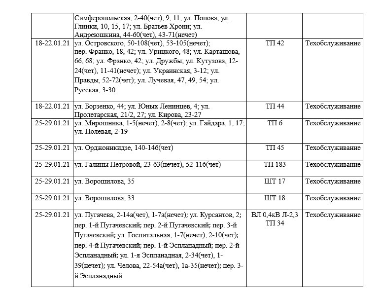 В связи с плановым ремонтом электрооборудования в январе в период с 8 до 17 часов будут происходить отключения линий электропередачи согласно нижеприведенному графику. Об этом сообщает ГУП РК «Крымэнерго», - передает Керчь.ФМ.