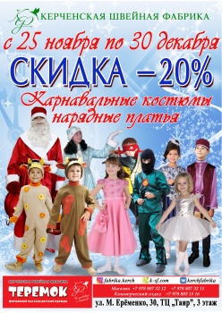 Скидки 20% на карнавальные костюмы и нарядные платья.