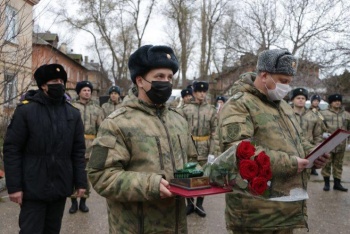 В честь уважаемого ветерана, прошедшего войну на легендарном танке Т-34, прозвучала его любимая песня "Три танкиста", с мелодиями военных лет выступил оркестр Росгвардии.