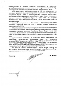 Постоянный читатель Керчь.ФМ уже некоторое время пытается добиться ремонта дороги по ул. Ульяновых. Он обратился с запросом в Министерство и получил ответ Министра транспорта Крыма.