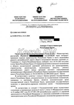 «Я житель района «Семь ветров», постоянный читатель Керчь.фм, как и обещал, повторно направил обращение в Министерство транспорта РК по вопросу ненадлежащего состояния дорожного покрытия по ул. Ульяновых в районе «Семь ветров» и наконец получил конкретный ответ за подписью самого министра транспорта Республики Крым Исакова Е.А. (прилагаю скан-копию на 2-х листах).