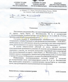 Жители многоквартирного дома по Фестивальной, 4 в Керчи получили письма о сносе дома. Керчане не понимают, что им делать: выносить мебель и жить на улице или ждать, пока приедут их выселять. Письмо и копию заявления администрации керчане прислали в редакцию Керчь.ФМ.