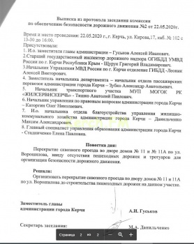 Курирующий зам Алексей Гуськов выслал в адрес керчанки выписку из протокола, согласно которой комиссия по безопасности дорожного движения заседала 4 месяца - с 31 января 2020 по 22 мая в составе в составе 9 человек (с указанием фамилий и должностей). Когда женщина обратила на это внимание, курирующий зам прислал другой вариант выписки. По ней уже заседали только 22 мая, но в количестве 8 человек (пофамильно). Ни в том, ни в другом варианте представителя МЧС не было.