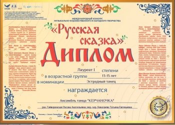 Также «Керчаночка» (руководитель Гайворонская О.А.) приняла участие в Международном online конкурсе музыкально-художественного и народного творчества «Русская сказка».