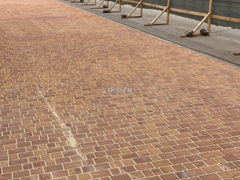 Здесь рабочие уже частично уложили новую плитку. Территория работ огорожена.