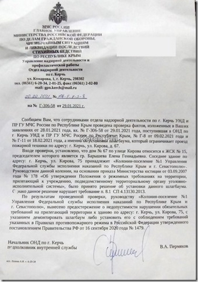 В редакцию Керчь.ФМ обратился постоянный читатель, который сообщил об установленном шлагбауме по Кирова, 67. Керчанин не ограничился одной жалобой, он также прислал ответ из МЧС по этому поводу.