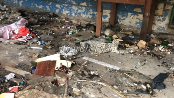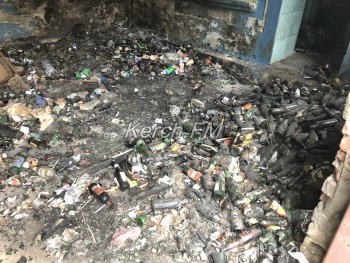 Некогда красивый фасад и побитые стекла открывают вид на свалку в здании. Здесь же висят таблички с адресом, а также предупреждение, что проводятся ремонтные работы. Еще одна табличка указывает, по всей видимости, на владельца здания - а именно АО «Камыш-Бурунский железорудный комбинат».