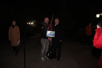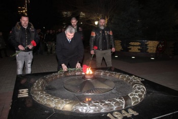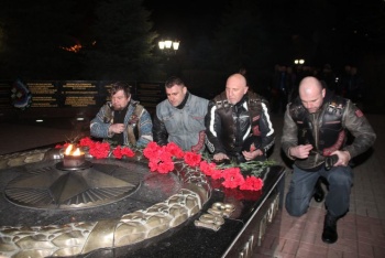 Колонна мотоциклистов проехала по городу, а затем в сквере Славы состоялась церемония возложения цветов к Вечному Огню и передачи саженца для Аллеи Русской весны, которая будет высажена завтра в рамках акции "Русский лес" на горе Гасфорта в городе-герое Севастополе.