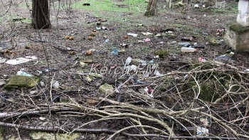 Отметим, что территория не вся заросла травой. Здесь есть хорошо вытоптанные тропинки по самим развалинам. Надеемся, это не дети их вытаптывают. В местах, где осталась не одна, а несколько стен - как всегда свалка.