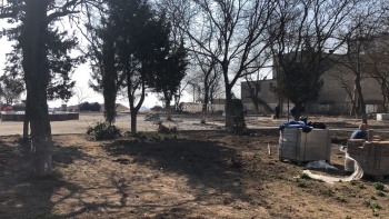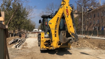 На территории работает техника. Зонирование территории произошло иначе: теперь новые участки приводят в порядок - ровняют основание и вымащивают плиткой.