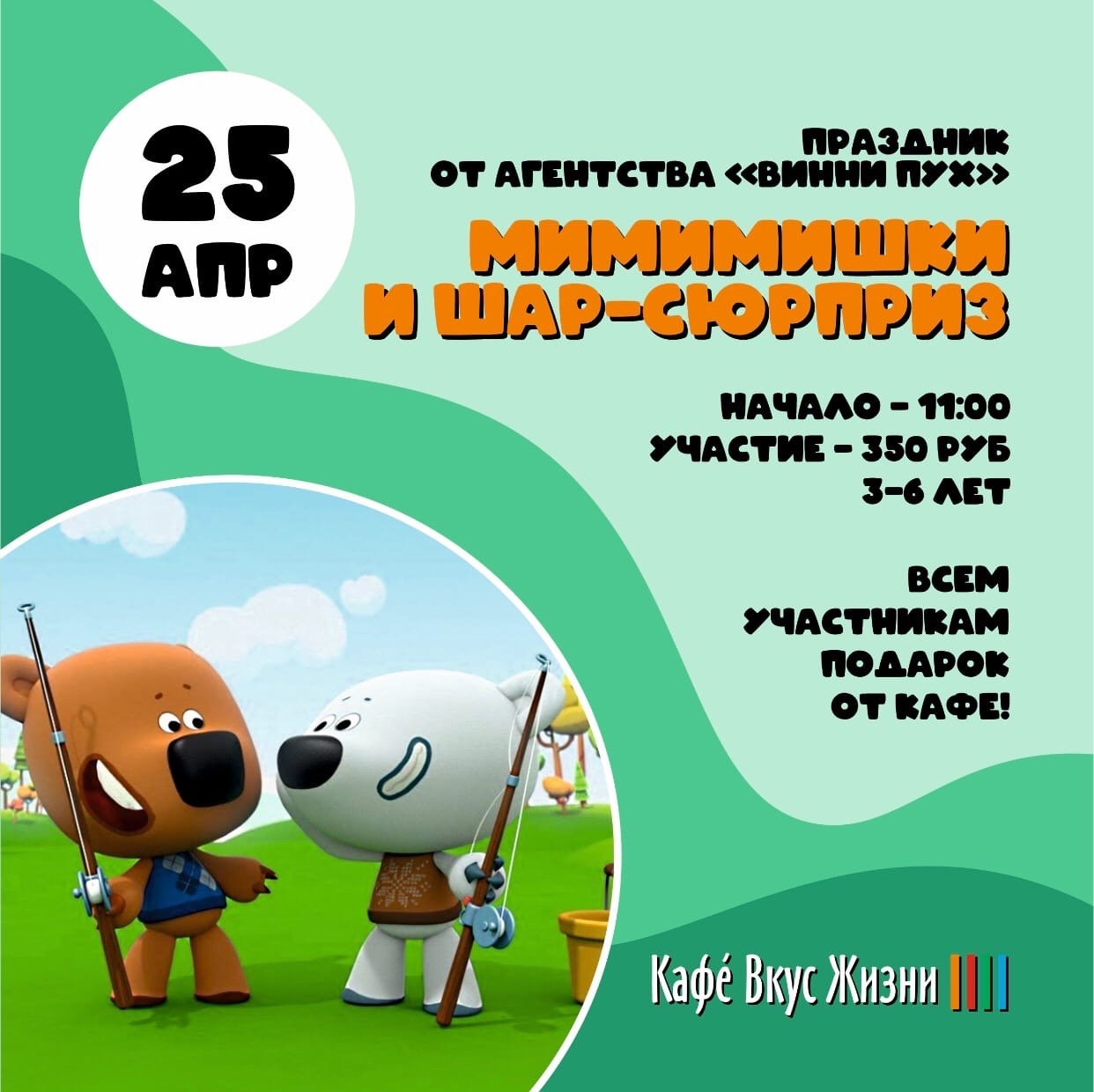 25.04, 11:00 - развлекательная программа для мальчиков и девочек с озорными Мимимишками. В программе игры, конкурсы, интерактивы и гигантский шар-сюрприз. Стоимость участия — 350₽. Возрастная категория — 3-6 лет. Всем участникам сладкий подарок от кафе!