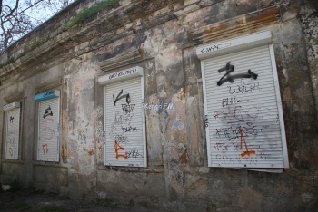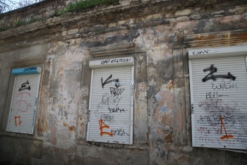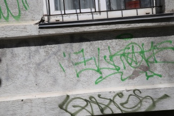 В Керчи на улице Театральной исписали фасады жилых домов и предприятий. Об этом Керчь.ФМ сообщили постоянные читатели.