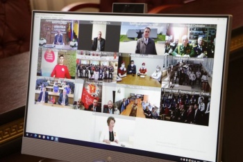 Затем в прямой трансляции, поочередно, звучали приветствия руководителей городов и регионов, представителей общественных организаций, были продемонстрированы видеофильмы о прошлом и настоящем городов-героев.
