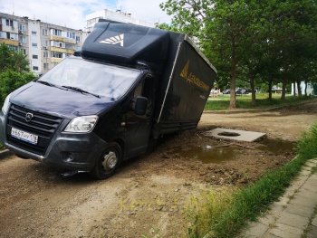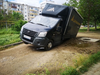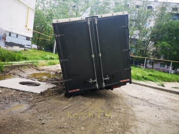 Как рассказал водитель открытый люк он видел и объехал, но о том, что вокруг люка не дорога, а пропасть знать никто не мог. Опасное место даже не было огорожено. Просто бросили после себя как есть и все. Вот такие внутридворовые дороги в Керчи.