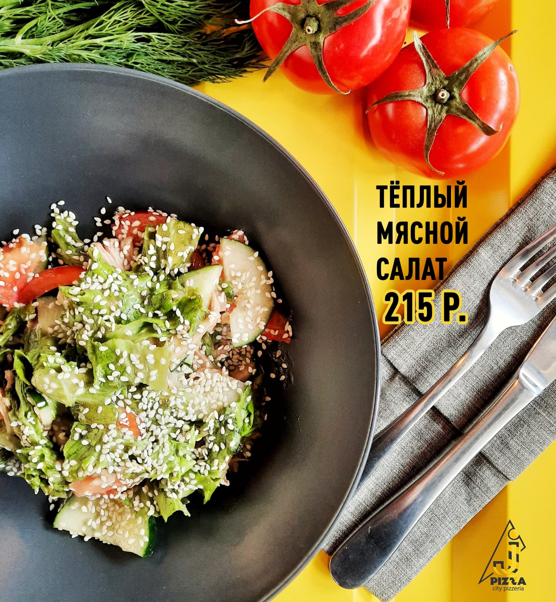 - Теплого мясного салата с томленой свининой, свежим миксом салата, спелыми томатами, свежим огурцом и ялтинским луком с горчично-медовой заправкой;