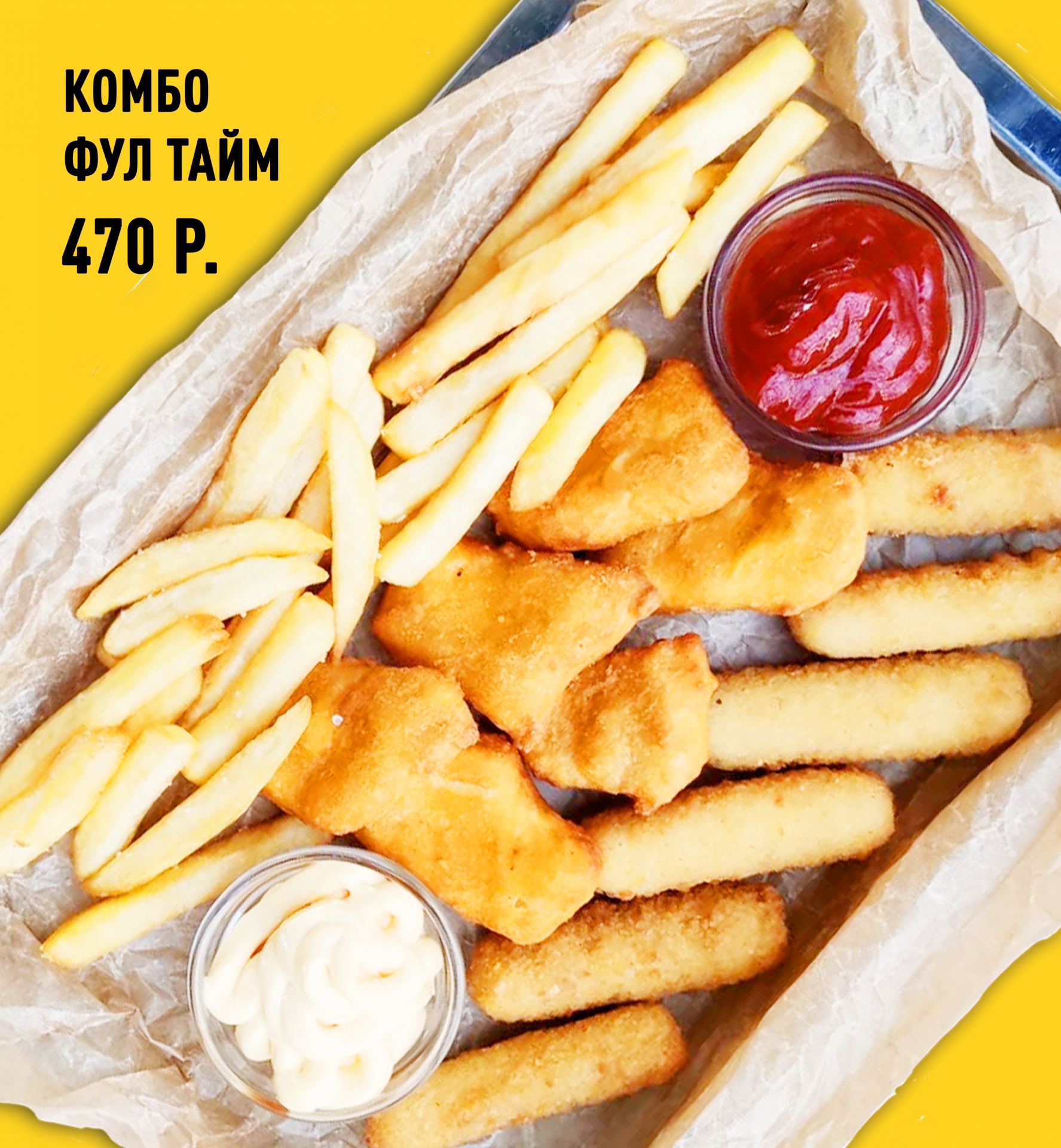 - Комбо Фул Тайм: куриные наггетсы + золотистая картошка фри + сырные палочки с сыром моцарелла + сырный соус и кетчуп.