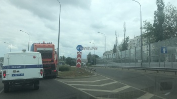 Здесь, с помощью техники, рабочие моют дорожные знаки. Чтобы объехать транспорт, водителям приходится пересекать сплошную.