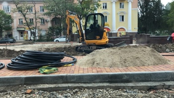 С помощью техники ровняют территорию у новых фонтанов. Также подводят коммуникации. Ограждения здесь убрали полностью.