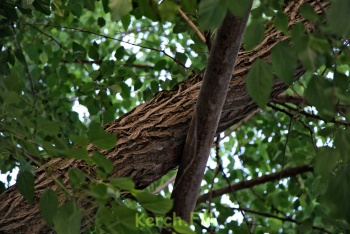 «Со стороны улицы Курсантов стоят 4 старых дерева, они, наверное, ровесники храма, который здесь раньше был. Деревья мощные, ветки диаметром 30 - 40 см уже откололись от ствола. Одно дерево уже наклонилось под углом 45 градусов. Корни выворачивают почву, а мы ходим с ожиданием когда они упадут. Другое дерево лежит на газовой трубе.