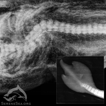 Обзорный рентген тела найденного в Алуште дельфинёнка выявил перелом позвоночника со смещением, полученный от тупого удара, что привело к смерти особи. В других морях травмы такого характера нередко фиксировались у детенышей, которым не повезло стать мишенью для взрослых агрессивно настроенных самцов.