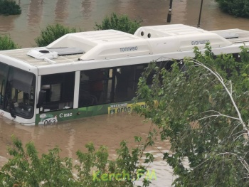 На Самойленко слились речка и дорога, дождь не оставляет шансов на улучшение ситуации. Городской автобус вместе с людьми заглох. Вода прибывает и угрожает затопить людей. Эвакуировать людей из затопленного в Керчи автобуса приехали спасатели, - передает Керчь.ФМ.