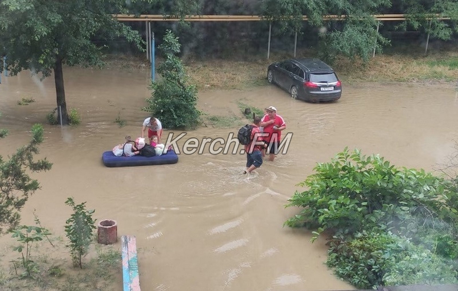 Керчь затопило, а людям все равно нужно передвигаться по районам. Так, изобретательный отец утром 17 июня решил проблему гениально: двоих детей и вещи он погрузил на надувной матрас и поплыл по дороге. Фото сделано в районе Казенки, 140 квартал
