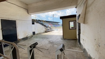 Ворота вернули на место, теперь на них написано, что стадион не работает. Специалисты приступили к демонтажу покрытия беговых дорожек. Они пришли в негодность.